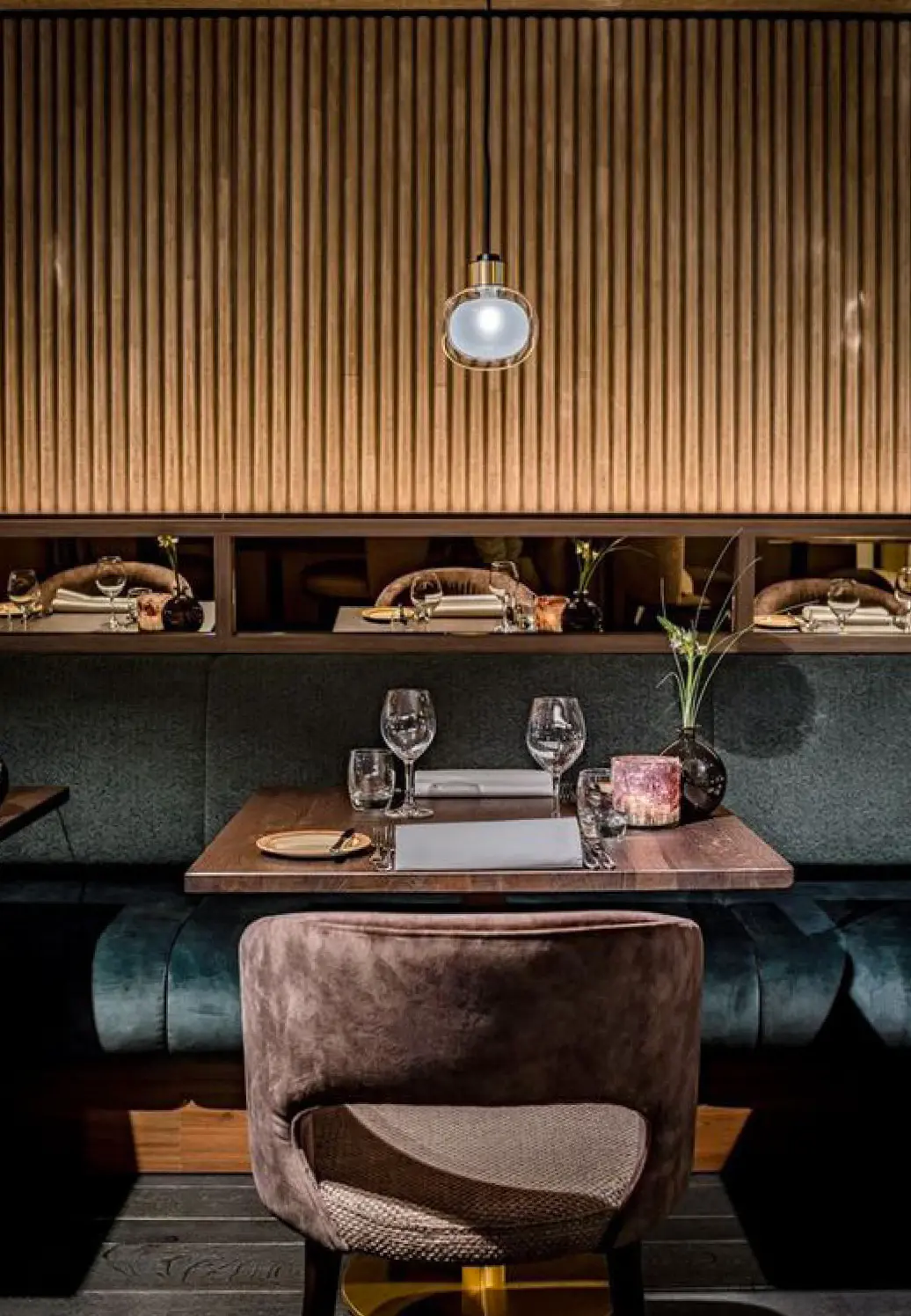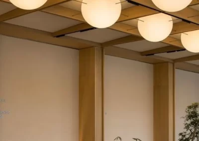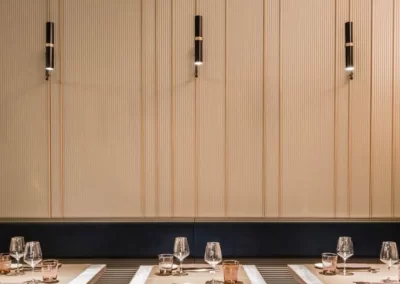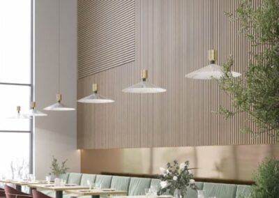 Acoustic panel baffles offer a dual-purpose solution for creating a decorative and high-end acoustic ceiling in a restaurant. By strategically placing these baffles and incorporating lighting elements, a seamless and aesthetically pleasing design can be achieved. Acoustic panel baffles with translucent or perforated designs allow lighting to pass through, this creates a visually stunning effect, adding depth and warmth to the space. This not only adds a layer of sophistication but also ensures that the accoustic solution seamlessly blends with the overall lighting design.